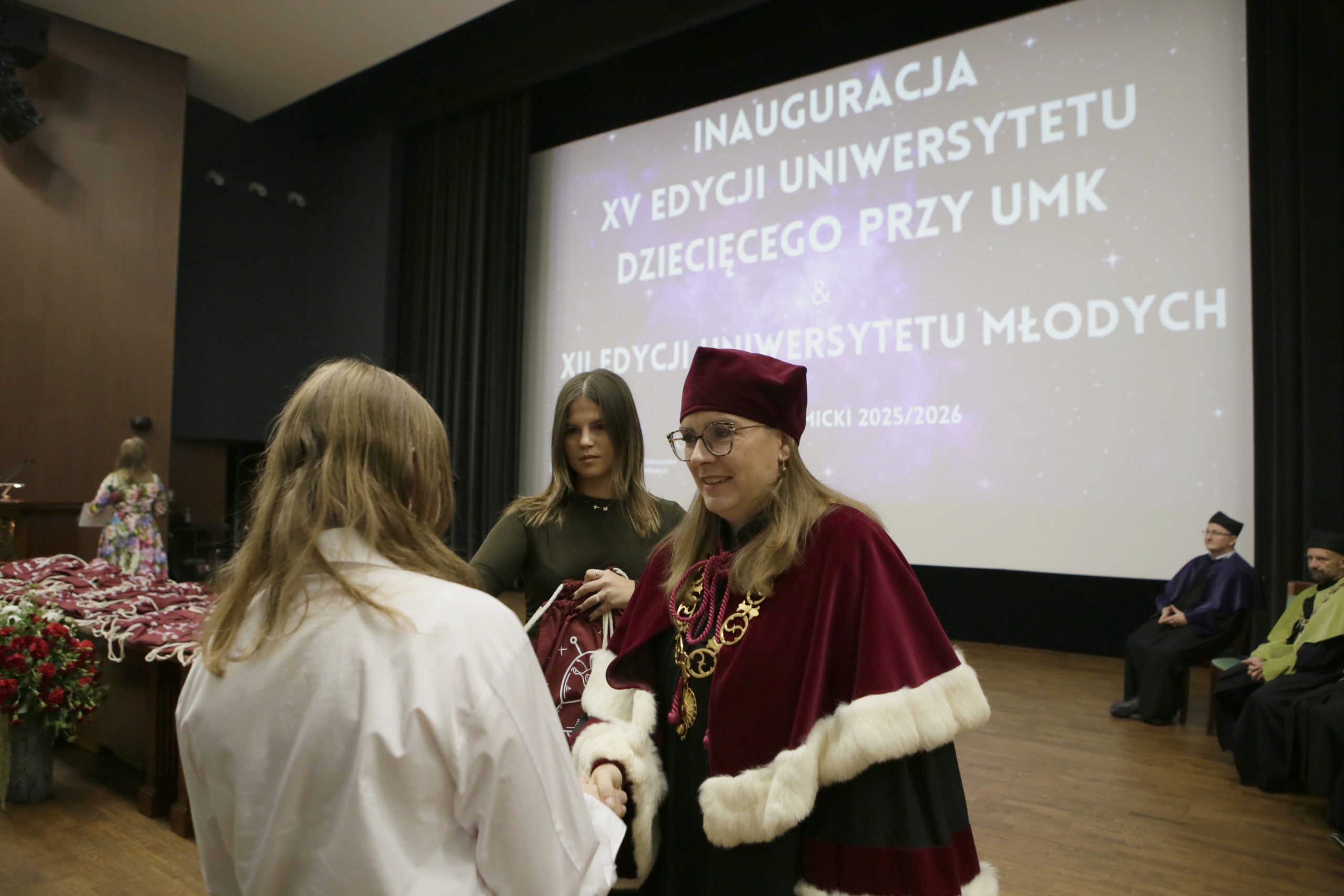 Oficjalnie rok akademicki rozpoczął się dla najmłodszych studentów 4 października. W Auli UMK pojawili się koordynatorzy projektu, władze uniwersytetu, prowadzący zajęcia (w ceremonialnych togach), a przede wszystkim kilka setek dzieci oraz ich rodziców. Głównym, choć nie jedynym, punktem programu było wręczenie indeksów. Poza tym rodzice i dzieci mieli okazję zobaczyć i usłyszeć część prowadzących zajęcia, a nawet zadać im kilka trudnych pytań z widowni.