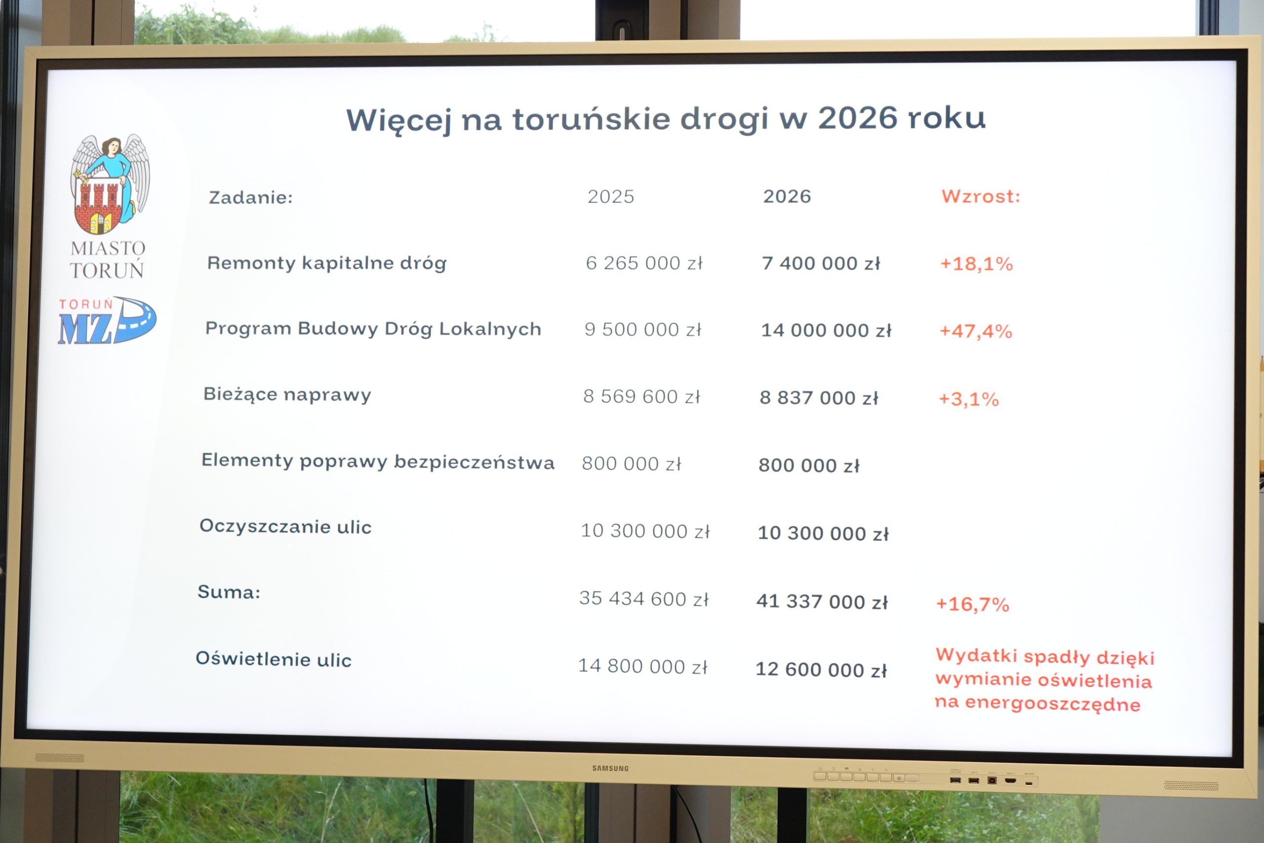 „Więcej na toruńskie drogi” to hasło, które pojawiło się podczas przedstawiania budżetu przeznaczonego na modernizację toruńskich dróg w 2026 roku. Większość kwot zarezerwowanych na realizację określonych zadań wzrosła w porównaniu do 2025 roku. Największy wzrost dotyczy Programu Budowy Dróg Lokalnych (aż 47,4%), ale zastrzyk gotówki dotyczy także remontów kapitalnych dróg (wzrost o 18,1%), i bieżących napraw (wzrost o 3,1%).