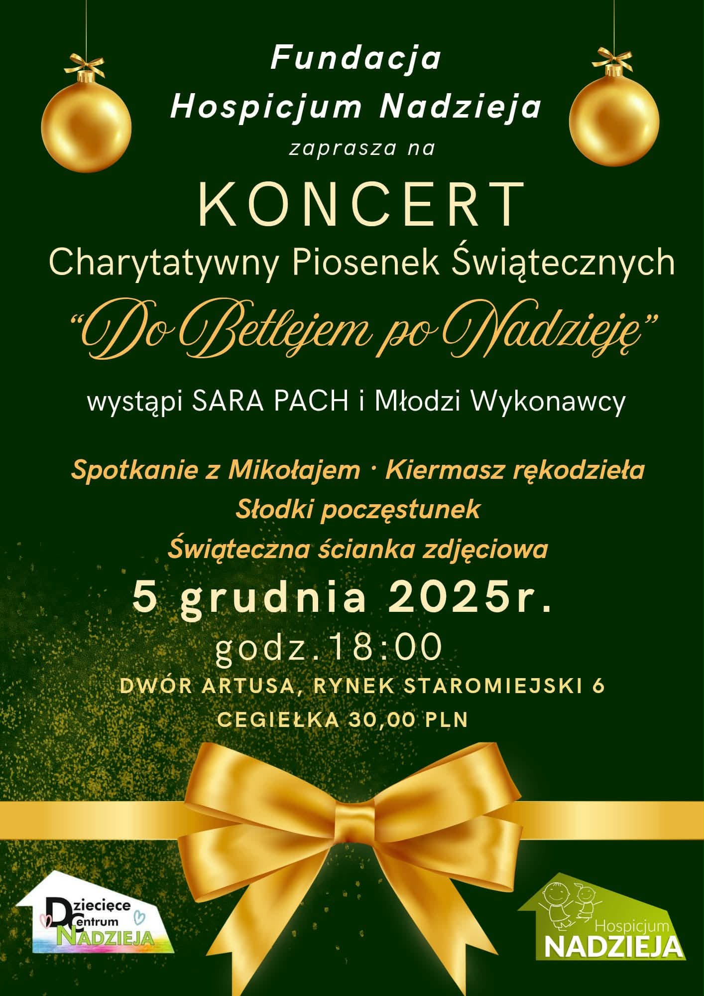 Pierwszy koncert dla Nadziei wprowadzi świąteczną atmosferę. 5 grudnia o godzinie 18:00 w Dworze Artusa zagrają Sara Pach i Młodzi Wykonawcy. W programie pod hasłem „Do Betlejem po Nadzieję” znajdą się popularne piosenki świąteczne, oraz tradycyjne kolędy. Będzie można także zrobić sobie selfie z Mikołajem oraz odwiedzić kiermasz ręcznie robionych dekoracji świątecznych. Na słuchaczy będzie czekał słodki poczęstunek oraz ścianka zdjęciowa. Cegiełka w formie biletu wstępu kosztuje 30 zł.