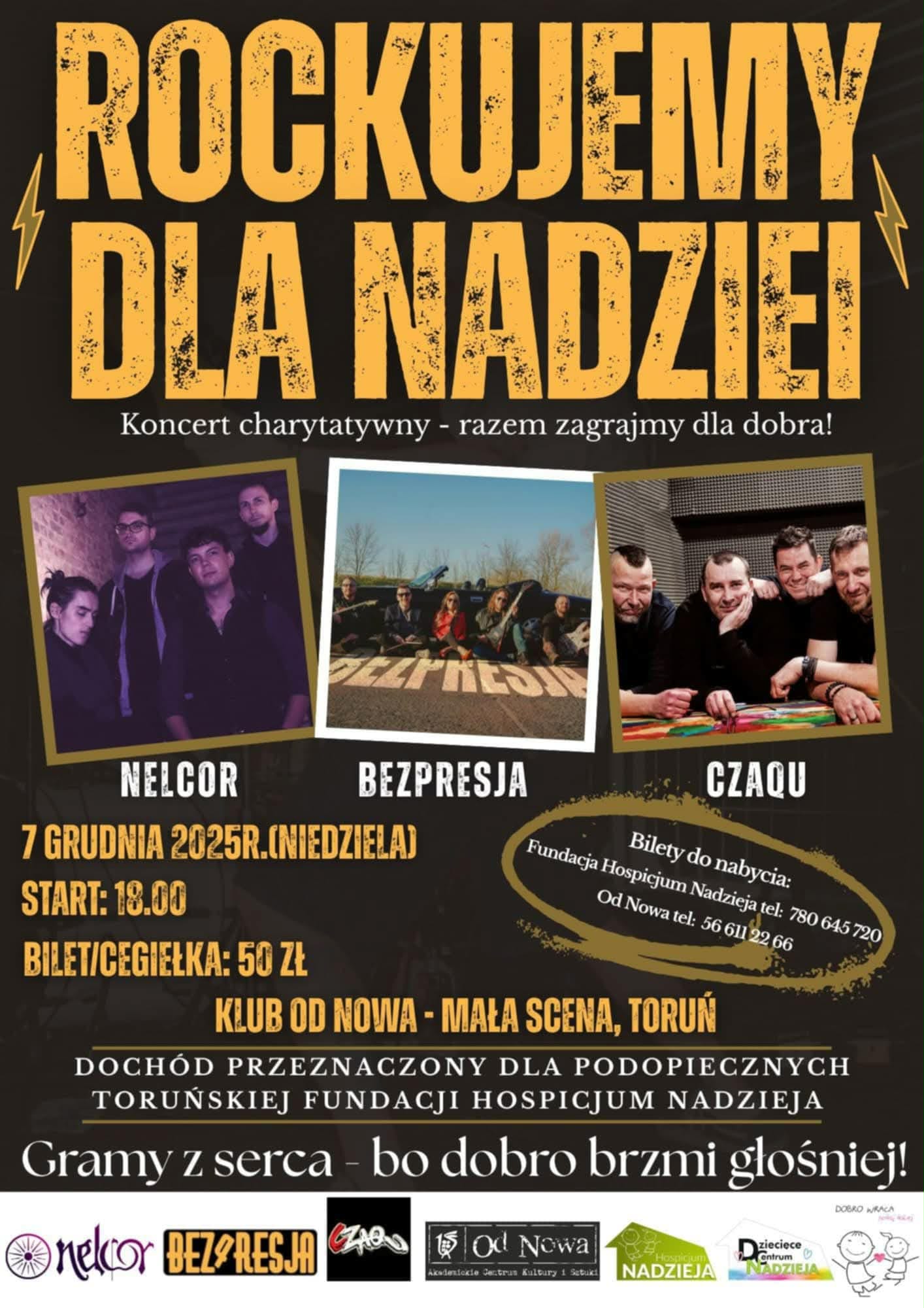 Dwa dni później, 7 grudnia, o godzinie 18:00 w klubie Od Nowa, znajdzie się coś dla fanów mocniejszych brzmień. Pod hasłem „Rockujemy Dla Nadziei” na małej scenie wystąpi trzech toruńskich wykonawców: Nelcor, Bezpresja oraz Czaqu. Organizatorzy zapewniają, że koncert będzie przepełniony energią, która ma nieść nadzieję i radość dla uczestników, artystów oraz dzieci potrzebujących wsparcia. Cena wstępu na ten koncert to 50 złotych.