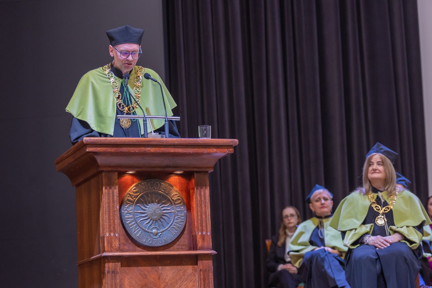 Zasadniczą część uroczystości w Auli rozpoczął Rektora UMK, prof. dr hab. Andrzeja Tretyna, który w przemówieniu podkreślał silną pozycję toruńskiej uczelni, jej wkład w polską i światową naukę oraz wskazywał przyszłe kierunki rozwoju Uniwersytetu.