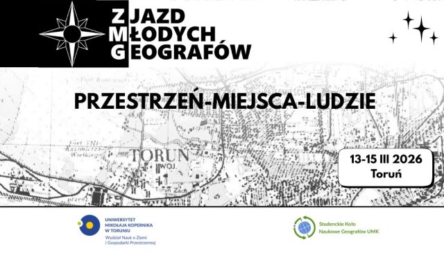 Zjazd Młodych Geografów to ogólnopolska konferencja naukowa orgaznizowana przez Studenckie Koło Naukowe Geografów UMK oraz Instytut Promocji Historii . Wydarzenie potrwa od 13 do 15 marca na Wydziale Nauk o Ziemi i Gospodarki Przestrzennej Uniwersytetu Mikołaja Kopernika w Toruniu. Uczestnicy wezmą udział w sesjach referatowych i posterowych oraz całodniowym wyjeździe terenowym prezentującym wyjątkowe walory Doliny Dolnej Wisły. Wydarzenie będzie okazją dla młodych naukowców i badaczy, by zaprezentować wyniki swoich badań, nawiązać kontakty naukowe lub wymienić się przemyśleniami z ludźmi o podobnych zainteresowaniach. Organizatorzy zapewniają, że nie zabraknie również czasu na geograficzną integrację.